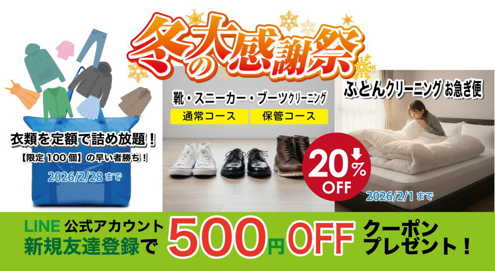 冬の洗濯悩みはクリカフェで解決!衣類詰め放題&スニーカー・革靴20%OFFキャンペーン開催